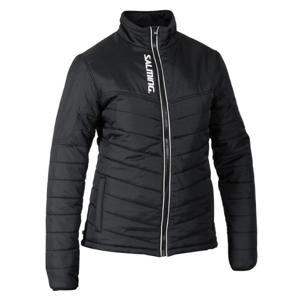 The Salming League Jacket is made in a light water repellent polyester fabric with polyester filling. It is designed with zippered hand pockets and printed logos. The upper body has plenty of space for team logos and the lower body is quilted for better flexibility.