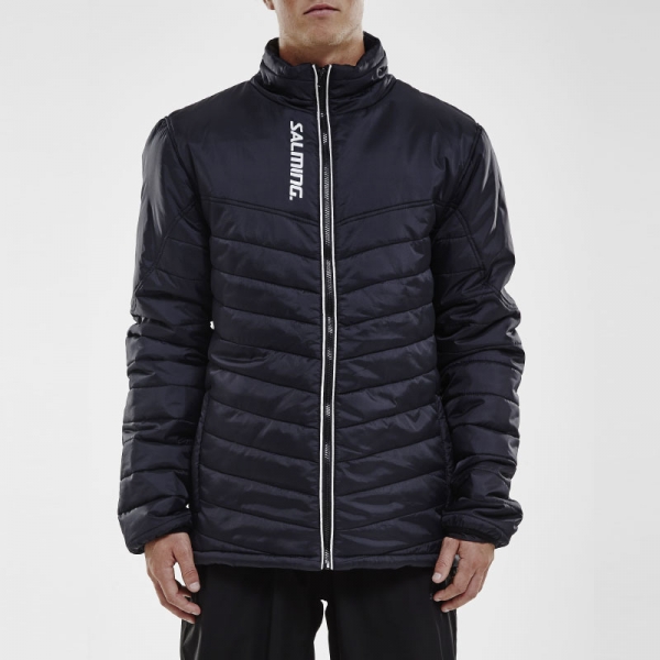 The Salming League Jacket is made in a light water repellent polyester fabric with polyester filling. It is designed with zippered hand pockets and printed logos. The upper body has plenty of space for team logos and the lower body is quilted for better flexibility.